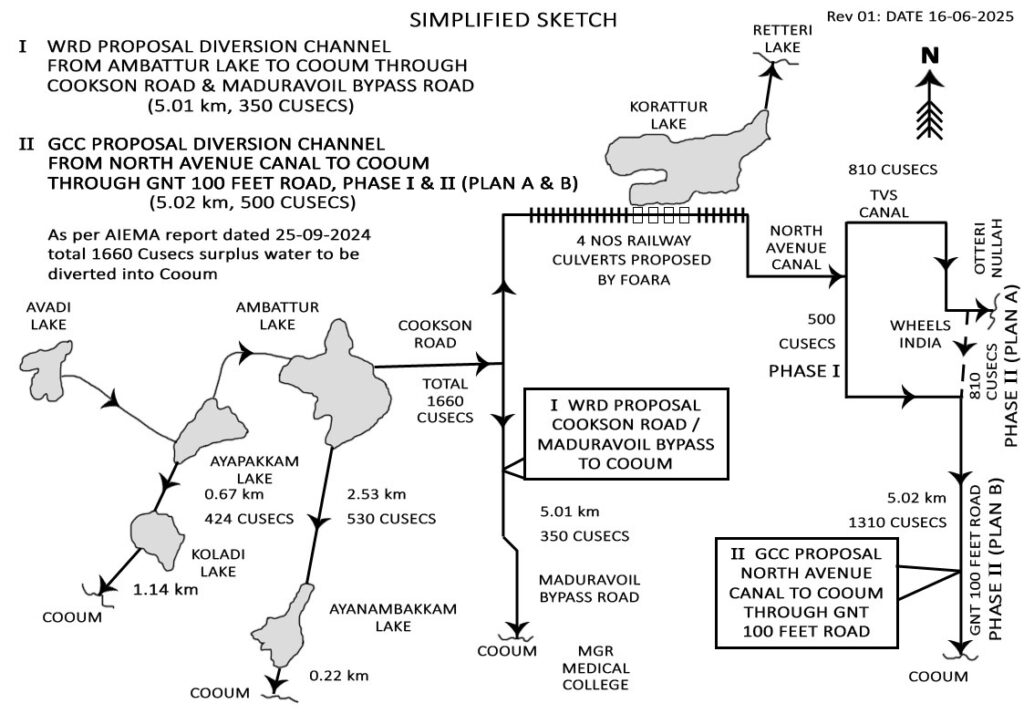 Based on WRD feasibility study there is no possibility of diverting surplus water Solution 1 & 2 upstream of Ambattur lake into Cooum during monsoon.