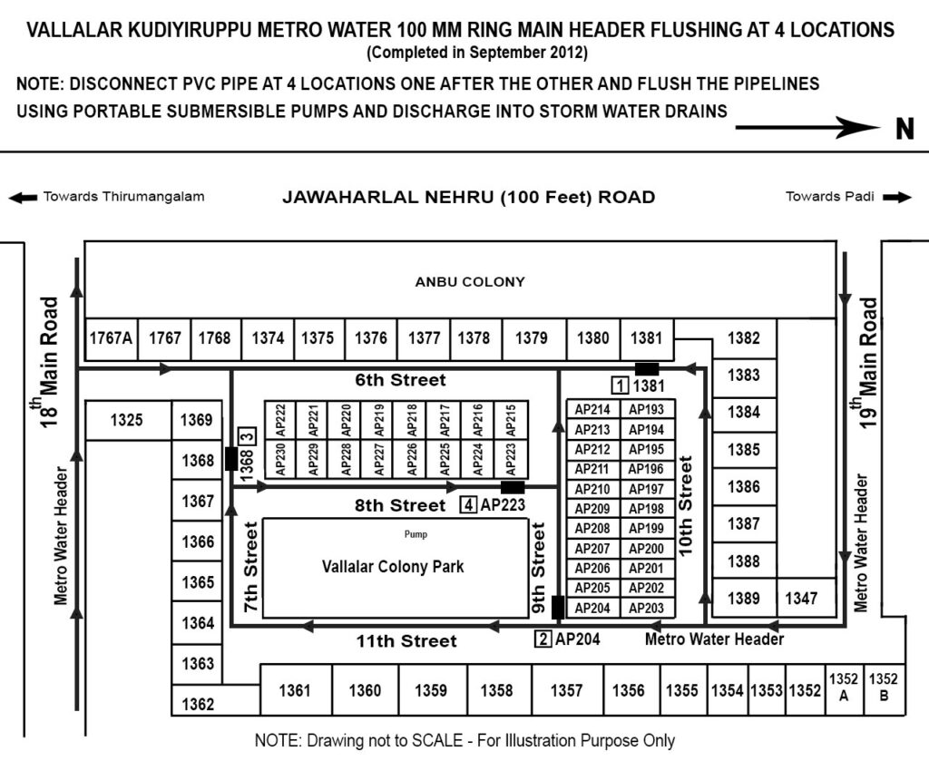 Under the instructions of Mr. Puvi Arasu Deputy Area Engineer VIII CMWSSB, contractor Mr. Kandasamy carried out Metro water Ring Main Headers Flushing in Vallalar Colony today at 4 locations near Plots No.1381, 1368, AP 204, AP 223 as shown in the Simplified Sketch.